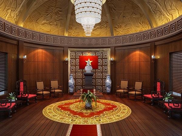 Khi thi công nội thất văn phòng khánh tiết không chỉ quan tâm đến vẻ đẹp, thẩm mỹ hiện đại sang trọng mà cần đặc biệt chú ý đến những chi tiết, hoa văn biểu hiện văn hóa, tinh hoa núi sông và sức mạnh dân tộc. Bình thường ở các phòng khánh tiết thông thường những tượng trưng như quốc kỳ, quốc huy , trống đồng , chim Lạc Việt…Những chi tiết này tượng trưng cho tinh thần đoàn kết luôn hướng về cội nguồn dân tộc, sự vĩnh hằng của đất nước Việt Nam và phần nào đó biểu hiện được đặc trưng , độc đáo của dân tộc trong mắt quan chức khách mời tham dự.
