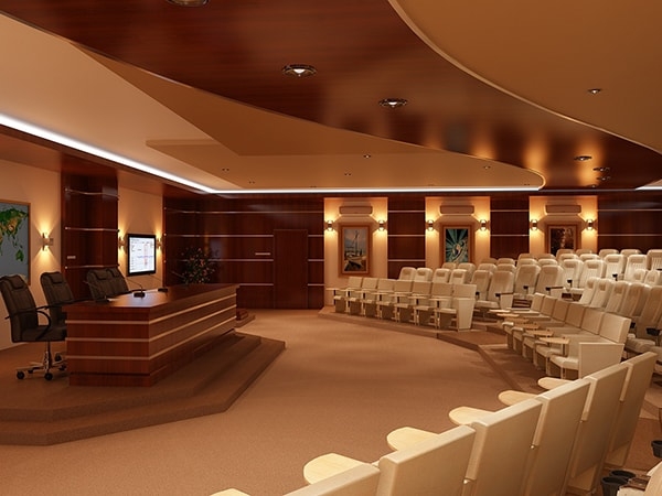 Vẻ đẹp sang trọng, hiện đại, không những được thể hiện rõ trong cách bài trí, mà còn được thể hiện trong cách lựa chọn đồ nội thất đồng bộ cũng khiến cho không gian thêm tinh tế và chuyên nghiệp hơn. Nên chọn loại ghế ngồi hội trường có đệm tựa, và bàn viết nhỏ vừa độc đáo mà lại tiện nghi. Mỗi hàng ghế được ngăn cách nhau bởi một lối đi nhỏ về hàng dọc, và các bậc thang theo chiều ngang. Ngoài ra, cũng nên chú ý đến màu sắc của ghế sao hài hòa với tổng thể không gian, màu thông thường mà màu trầm như: đỏ đậm, đỏ đô, xanh đậm. Bạn cũng nên thiết kế mẫu đèn trần âm tường để tạo điểm nhấn ấn tượng cho hội trường hiện đại, bởi vẻ đẹp cũng như tác dụng của nó. Nó không chỉ cung cấp đầy đủ ánh sáng mà còn tạo nên nét độc đáo, lạ mắt.
