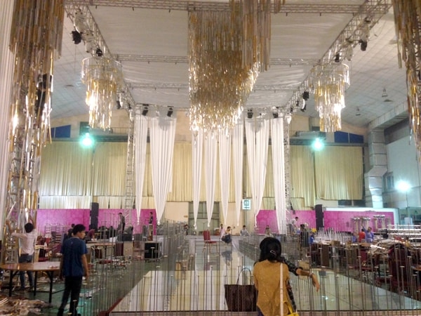 Phía trên trần hội trường được thiết kế uốn lượn như những con sóng lớn, vừa giúp tạo hiệu ứng âm thanh tốt hơn, vừa tạo nên nét đẹp thẩm mỹ bằng các đường cong và hệ thống đèn chiếu sáng cao cấp, cung cấp ánh sáng đầy đủ cho không gian hội trường.