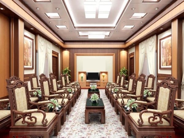 Với phòng khánh tiết tiết kiệm về không gian sử dụng, nên chọn nội thất chủ đạo, ví dụ như: sofa, tảm, bàn khánh tiết… Tránh bày nhiều thứ không tập trung sẽ khiến rối mắt.